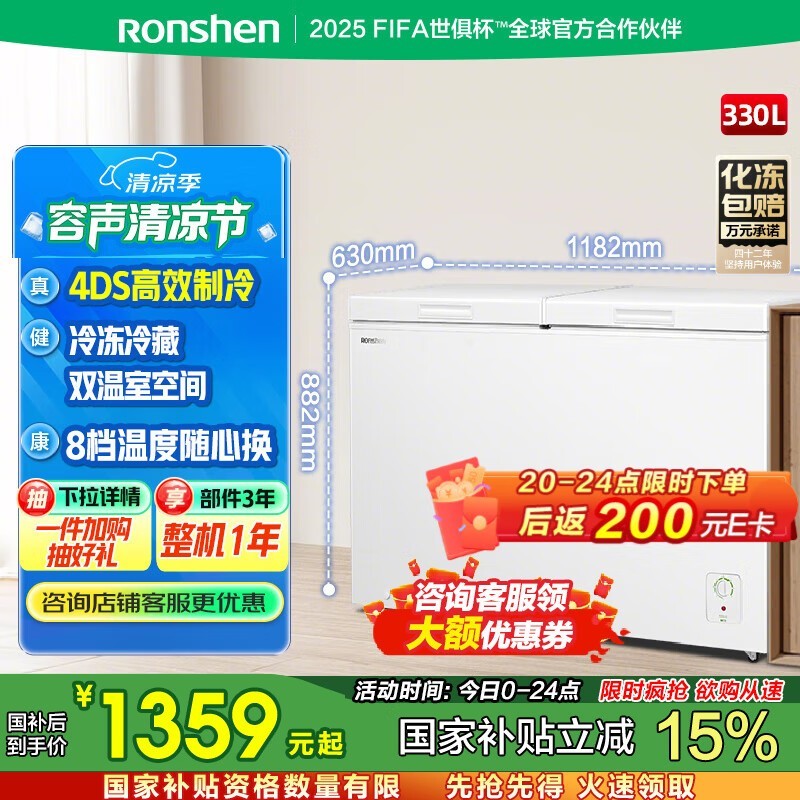 容声330升冰柜大容量节能静音家用商用双温冷柜